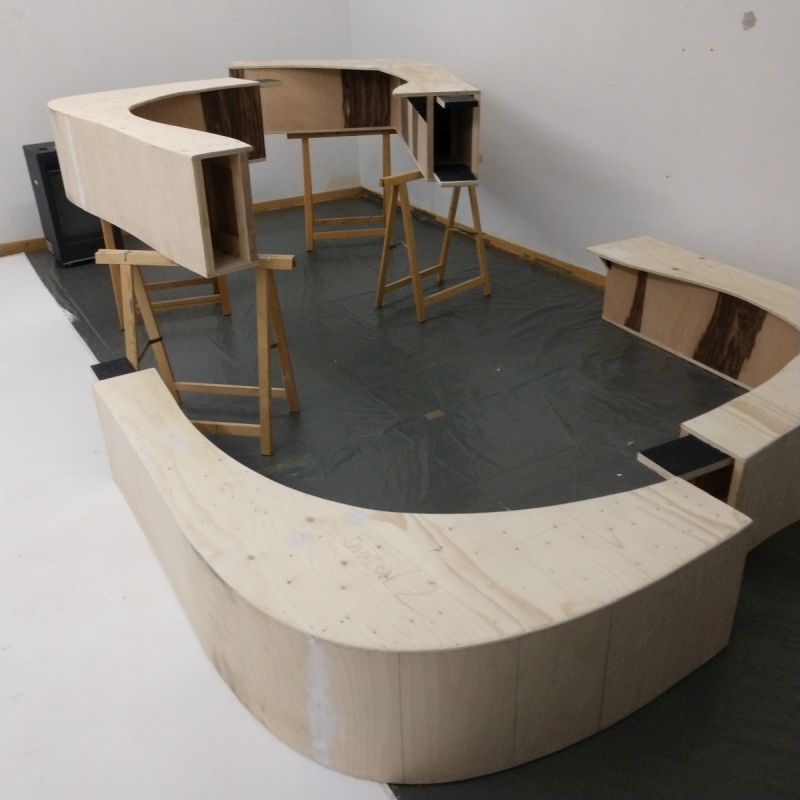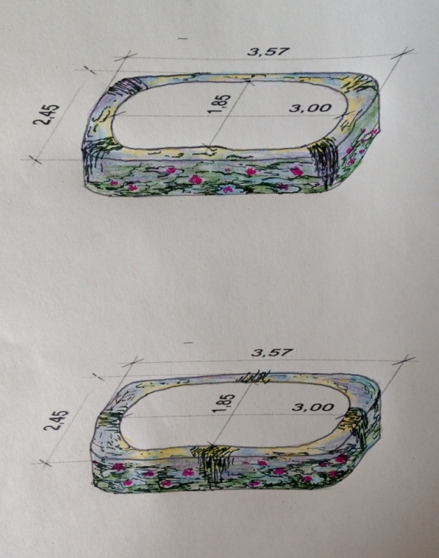 In den Wekstätten des Gießener Theaters wurde der Korpus des Bällebads gebaut. Die einzelnen Teile erreichten die Werkstatt mit einer Skizze, wie das Motiv der "Seerosen" auf das Bällebad übertragen werden soll und einer Vorlage eines Bildausschnittes von Claude Monets "Seerosen".