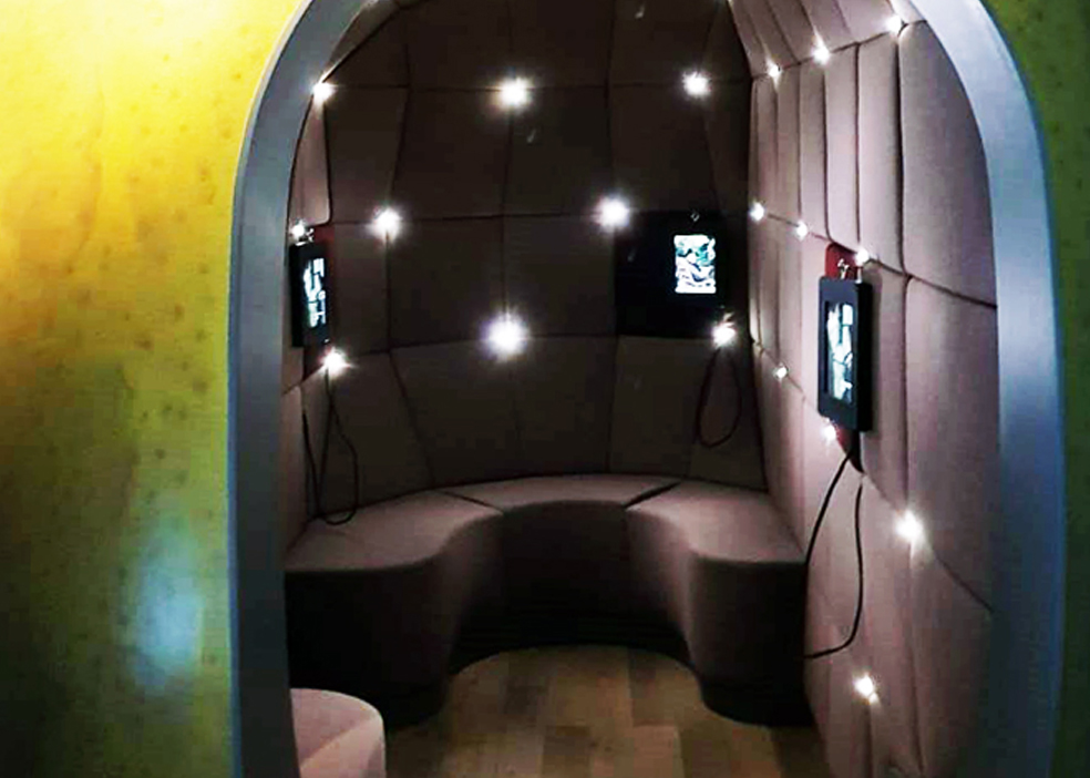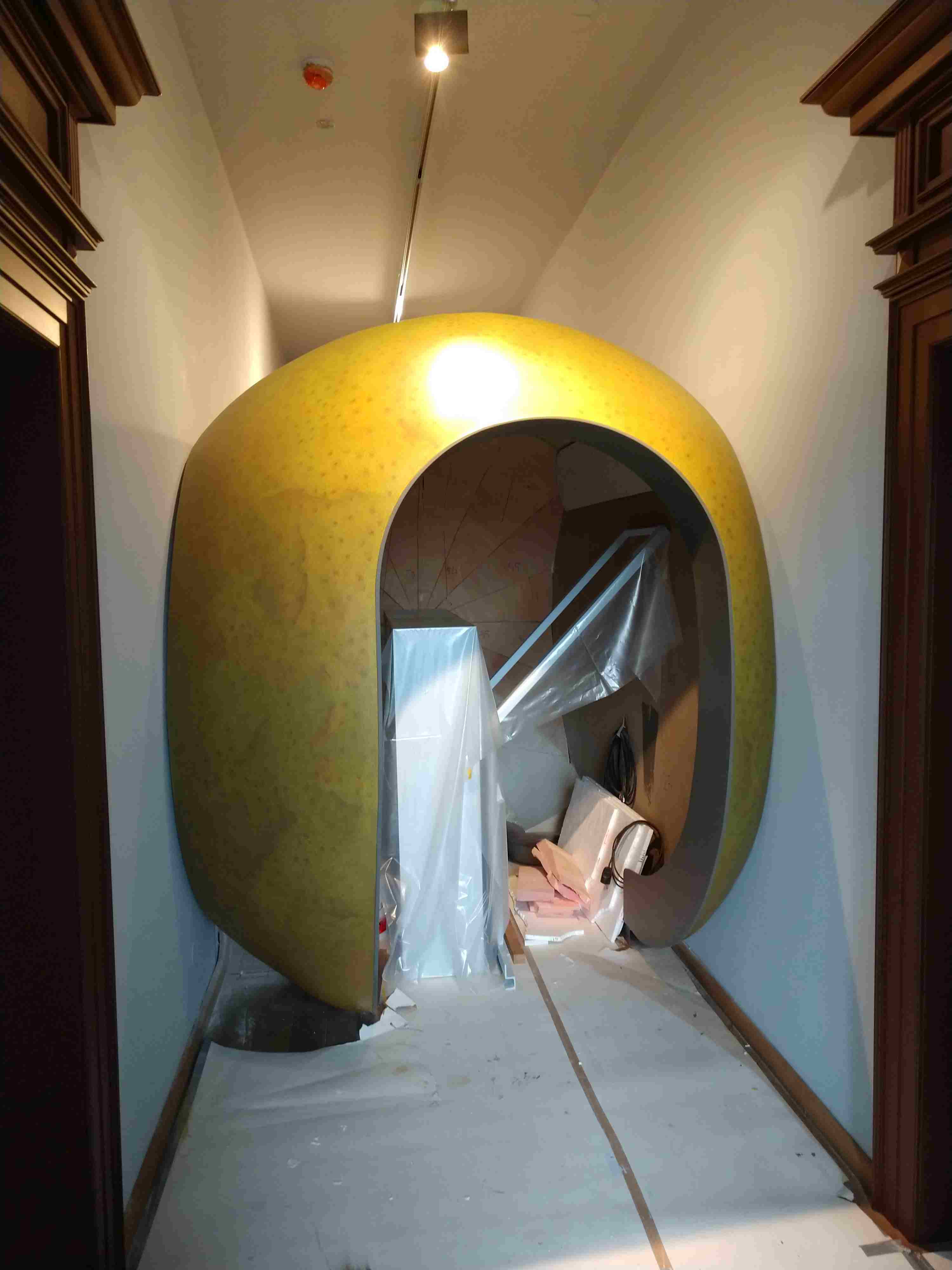 Dazu gehört als besonderes Highliht eine begehbare Birne vom Typ "Gute Luise". Entstehen sollte der Eindruck einer übergroßen Birne, welche eingezwängt im Raum dennoch natürlich wirkt.